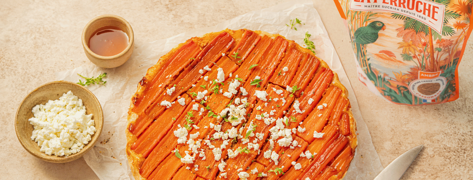 Discover our delicious carrot tarte tatin, a savory and original version of the classic French dessert. Caramelized carrots with La Perruche Cassonade combine perfectly with mustard, feta and rosemary to create an explosion of flavors on the palate. This quick and easy recipe is perfect for a dinner party with friends or a family meal.
