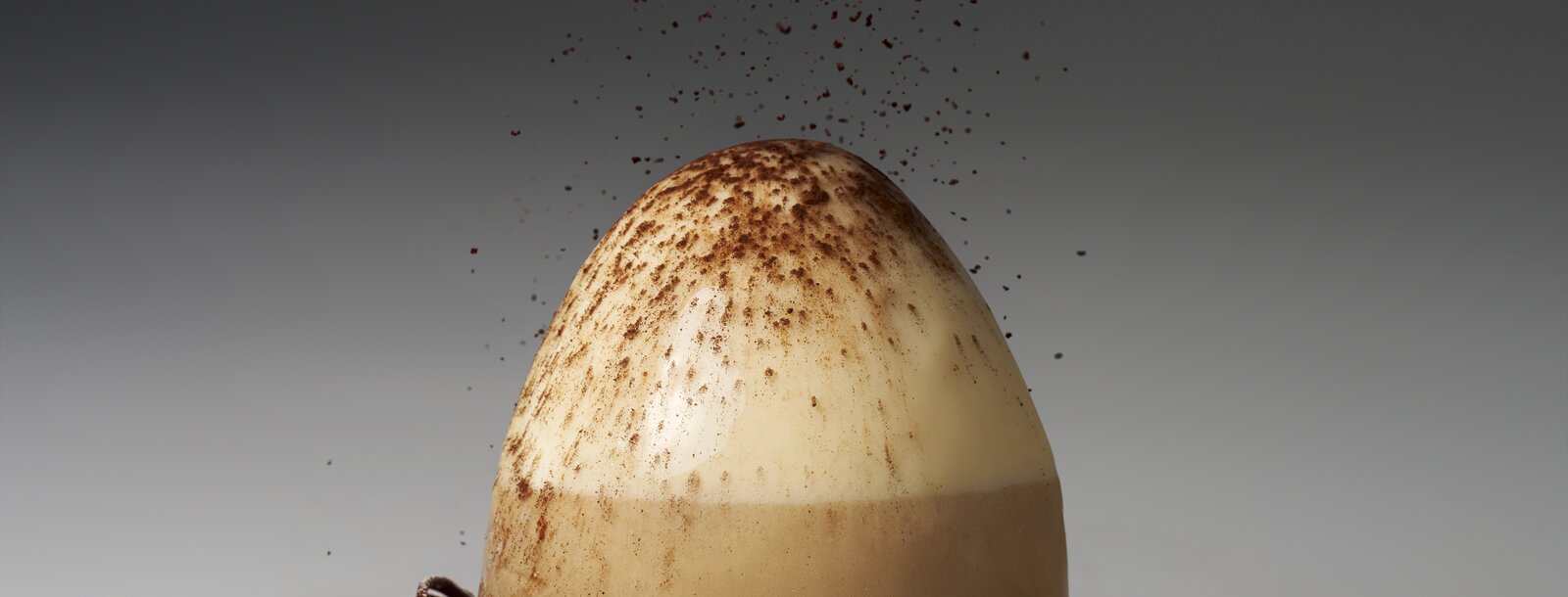 - Saupoudrer sur la mousse blanche un peu de cacao et recouvrir l’œuf d’un nappage transparent.