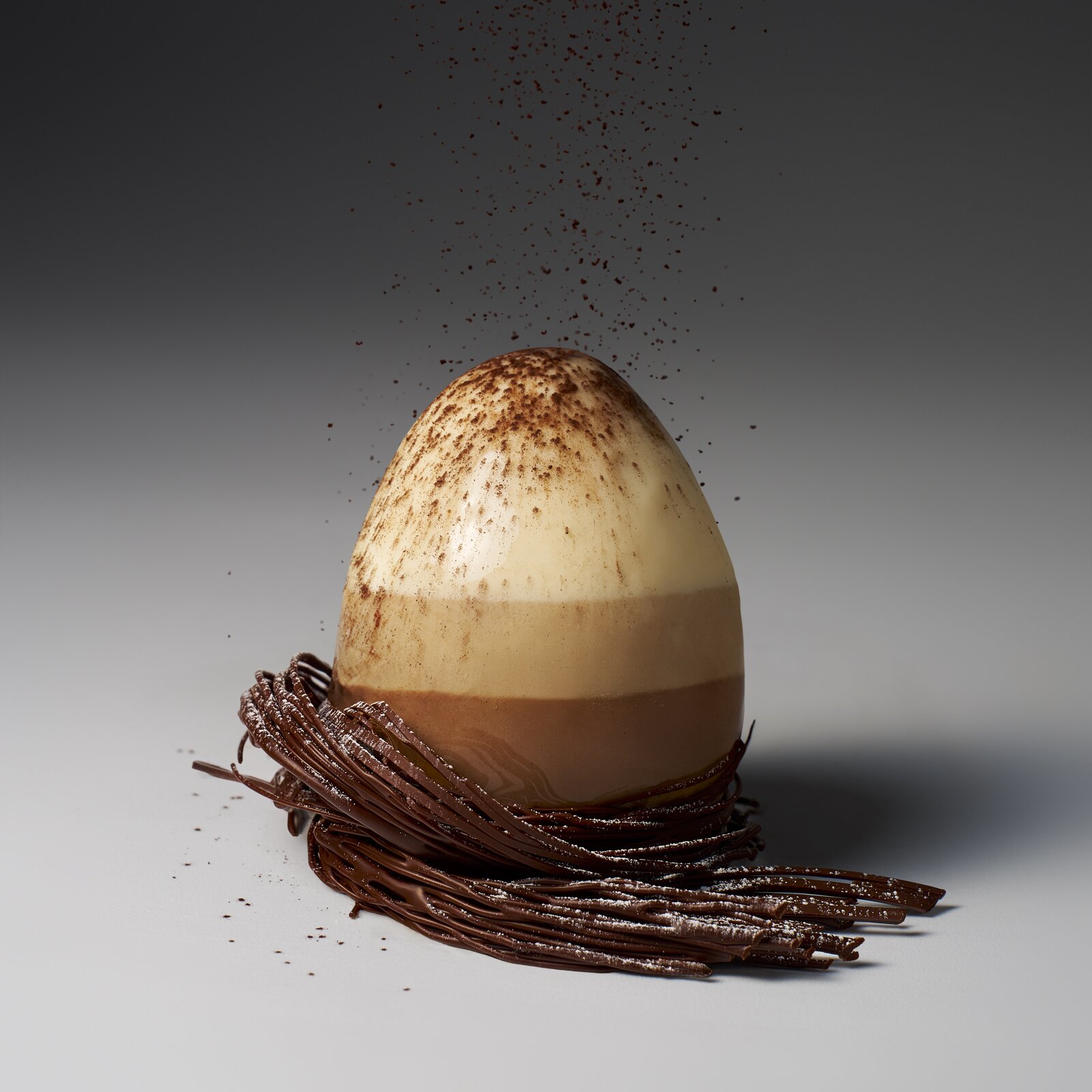 Célébrez Pâques avec ces petits œufs gourmands associant trois mousses au chocolat — blanc, lait et noir — sur un biscuit cacao et un croustillant feuillantine.